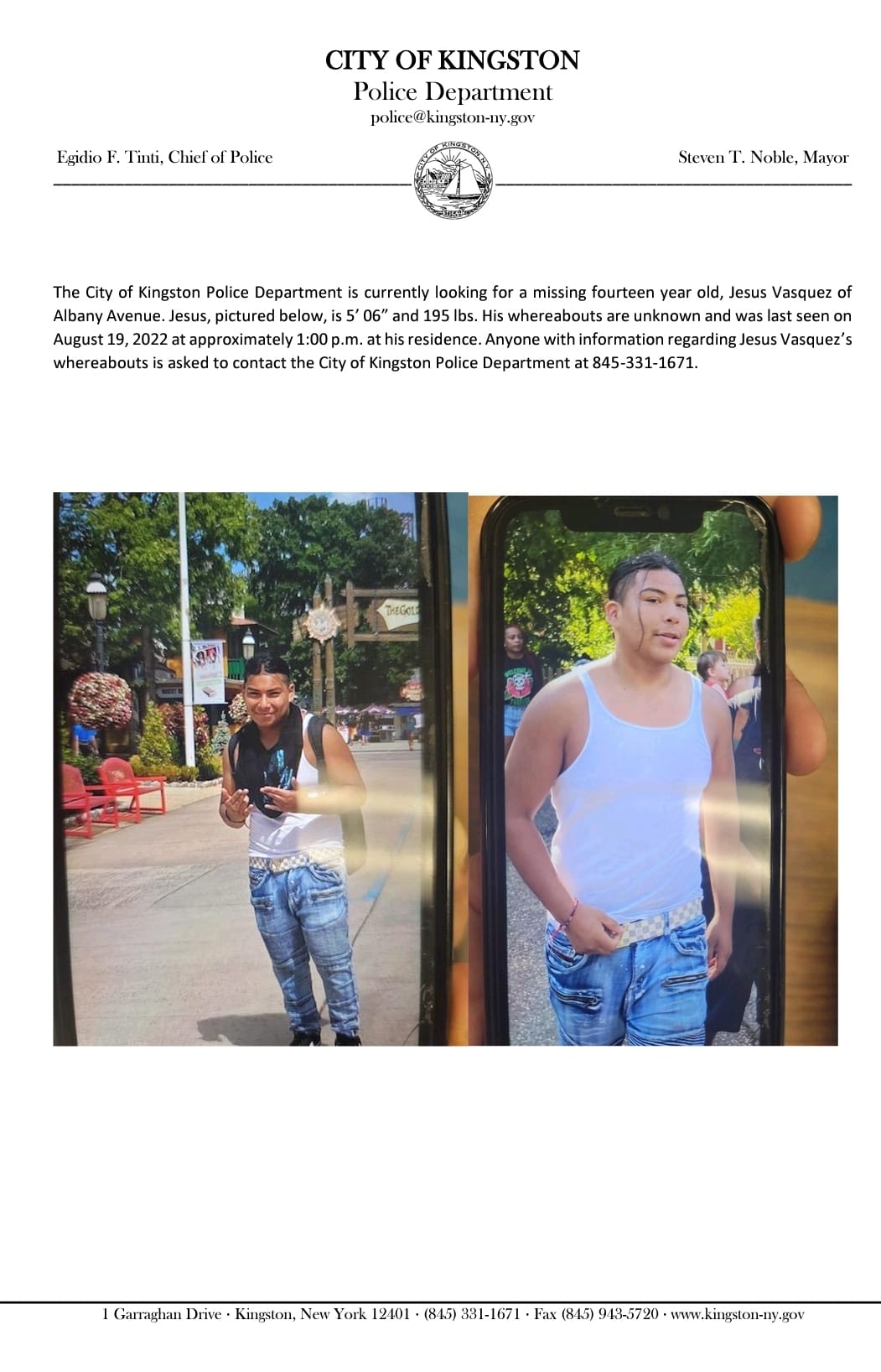 The City of Kingston Police Department is currently searching for a missing 14-year-old boy, Jesus Vasquez, of Albany Avenue.
