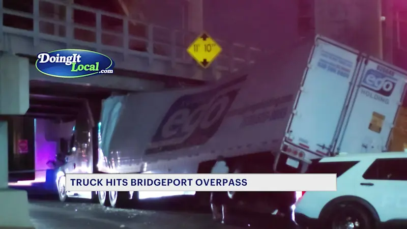 Tractor‑trailer strikes low overpass in Bridgeport, gets wedged underneath