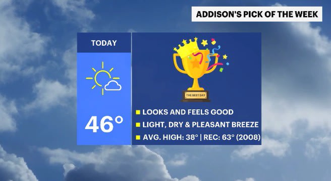 TODAY: PICK OF THE WEEK - Mostly sunny & pleasant. Highs: mid-40s.
