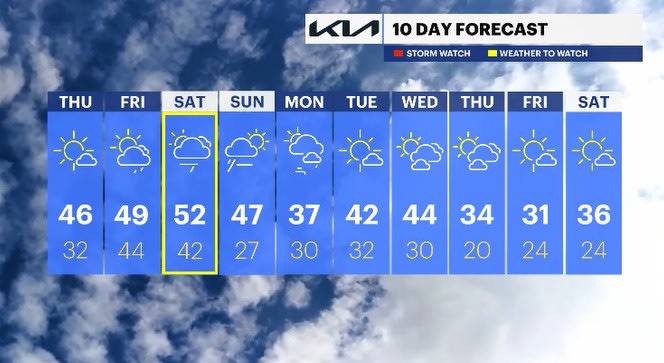 SATURDAY: Mostly sunny. Highs: mid-30s. Lows: mid-20s.