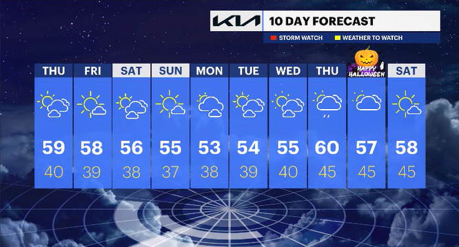 THURSDAY: Chilly morning, less breezy, with sunshine early in the day then more clouds mixing in the afternoon. Highs in the upper 50s to near 60 degrees. Lows near 40 degrees.