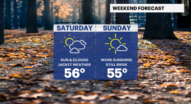 SUNDAY: Mostly sunny, still brisk but nice. Highs in the mid-50s. Lows in the upper 30s.