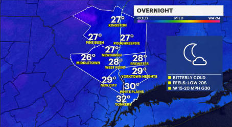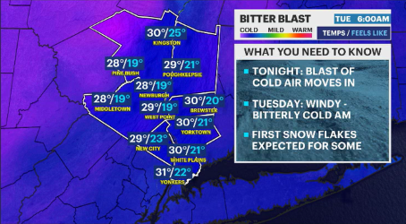 TUESDAY (VETERAN'S DAY): Bitterly cold morning, feels like the low 20s. Windy day, with some sunshine. Otherwise, cold. Highs near 40 degrees. Lows in the mid-30s. The average high temperature for White Plains is 54 degrees.
