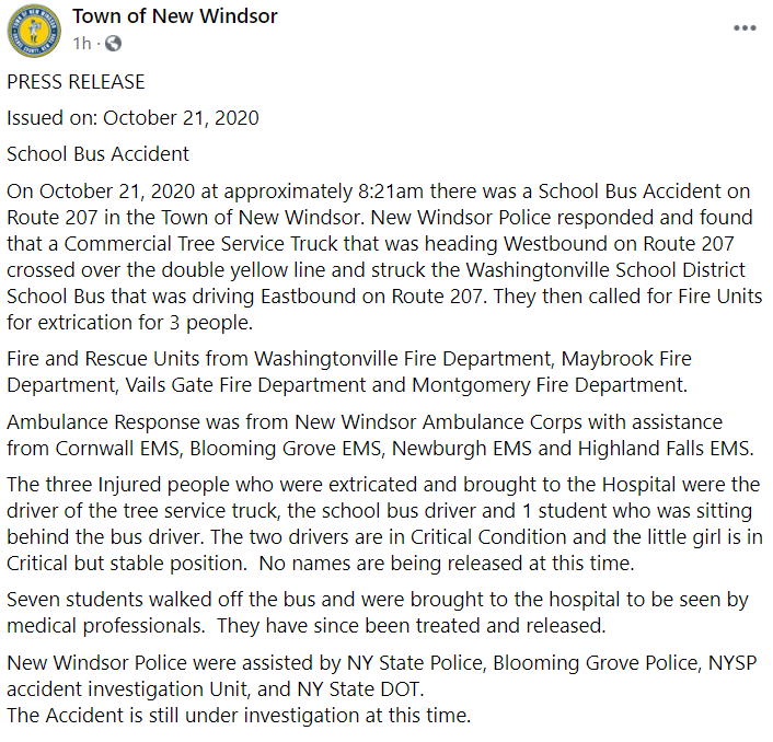 Authorities say eight children from Little Britain Elementary School were on board the bus just before 8:30 a.m. when a tree servicing truck crossed the double yellow line on Route 207 in New Windsor and crashed into bus and a third vehicle.