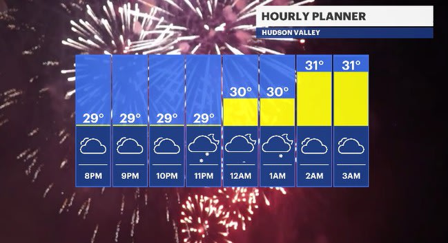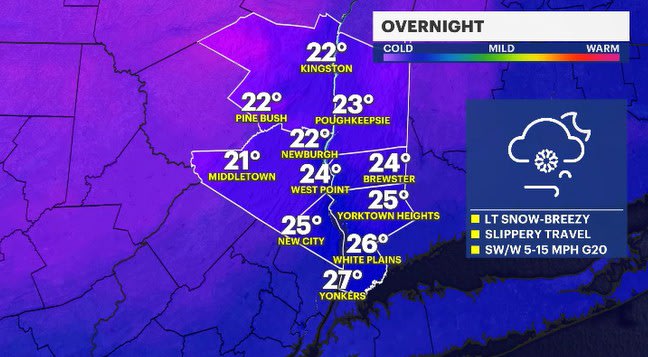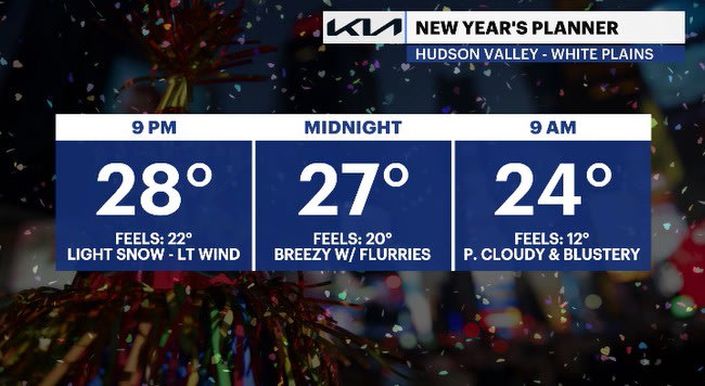 OVERNIGHT: NEW YEAR'S EVE - Light snow showers with breezy winds. Slipper travel conditions will be possible. Lows: low to mid-20s.