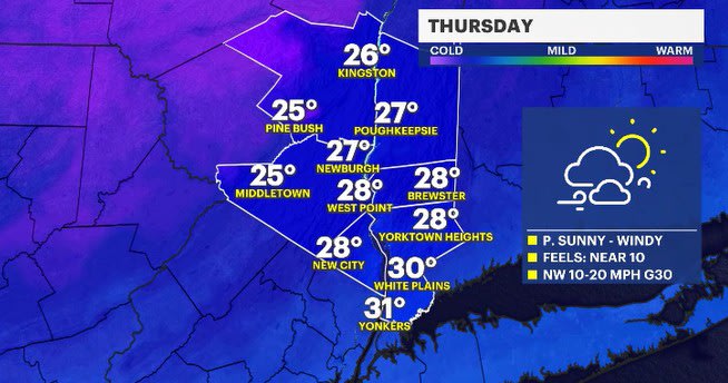 THURSDAY: NEW YEAR'S DAY - Partly sunny with a flurries chance early in the morning with gusty winds to follow. Highs: upper 20s. Lows: mid-10s.