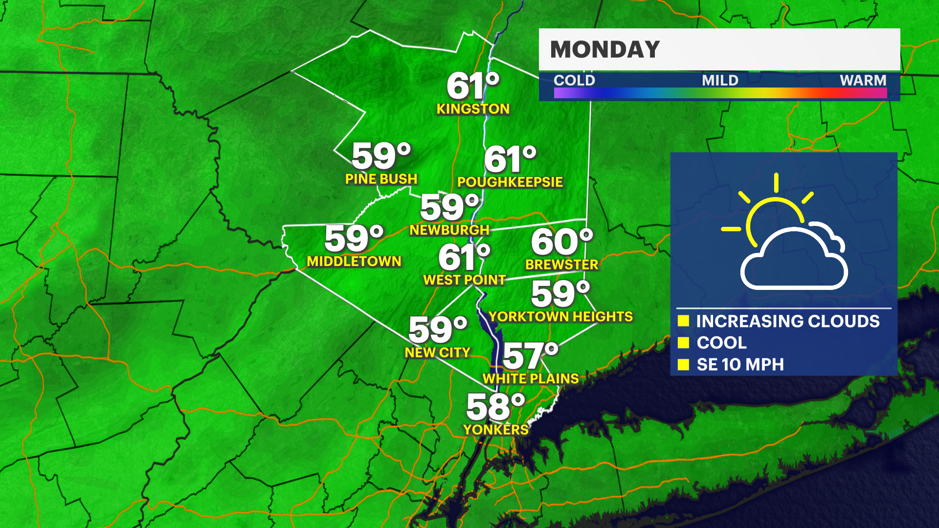 MONDAY: Mostly cloudy with a few stray downpours. Highs in the low 80s, lows near 70 degrees.