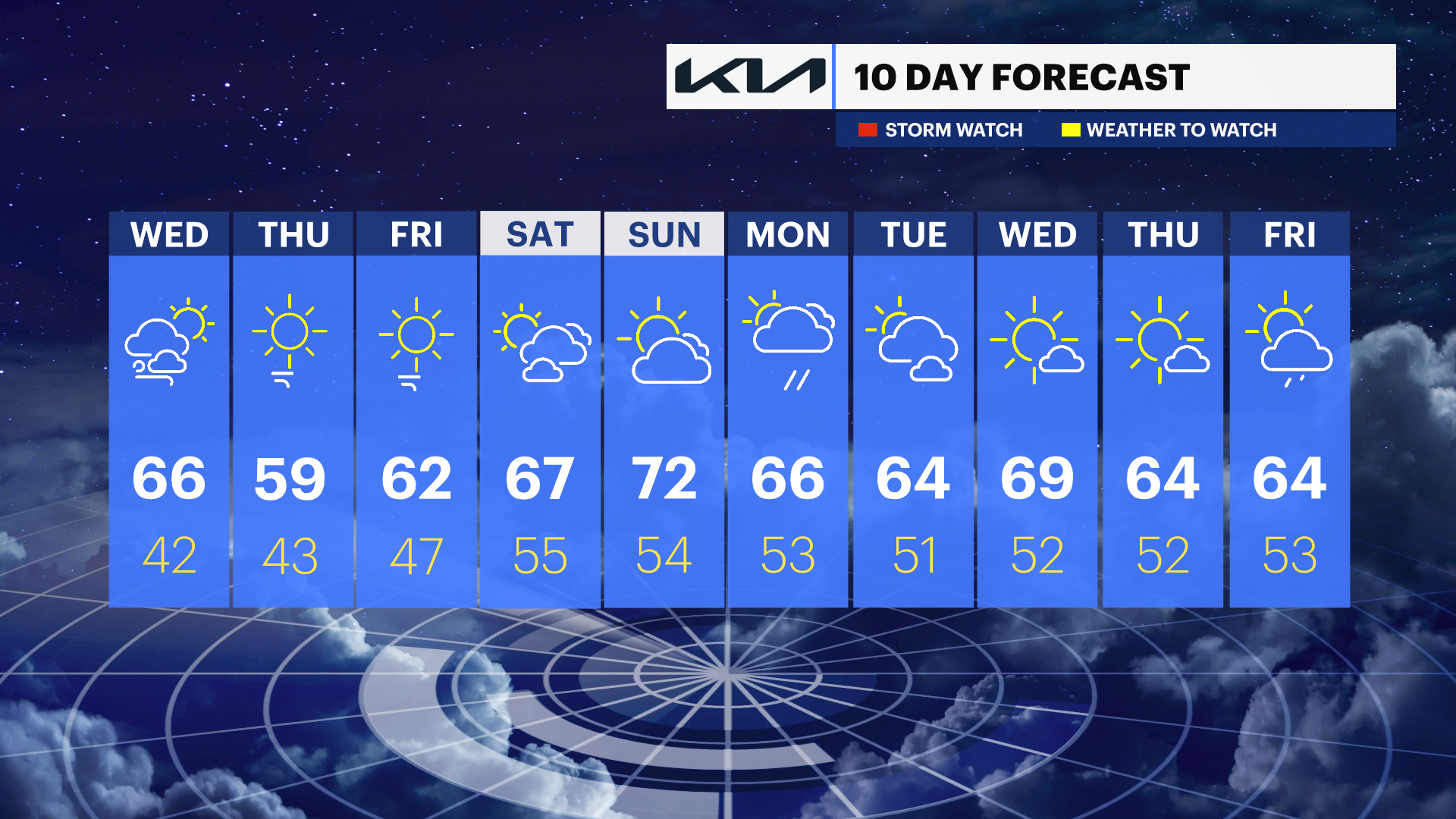 WEDNESDAY: Mostly cloudy with a few hints of sun in the morning. More sunshine develops into the afternoon. Breezy and nice for this time of year in the afternoon with highs around 66 degrees. Lows around 42 degrees.