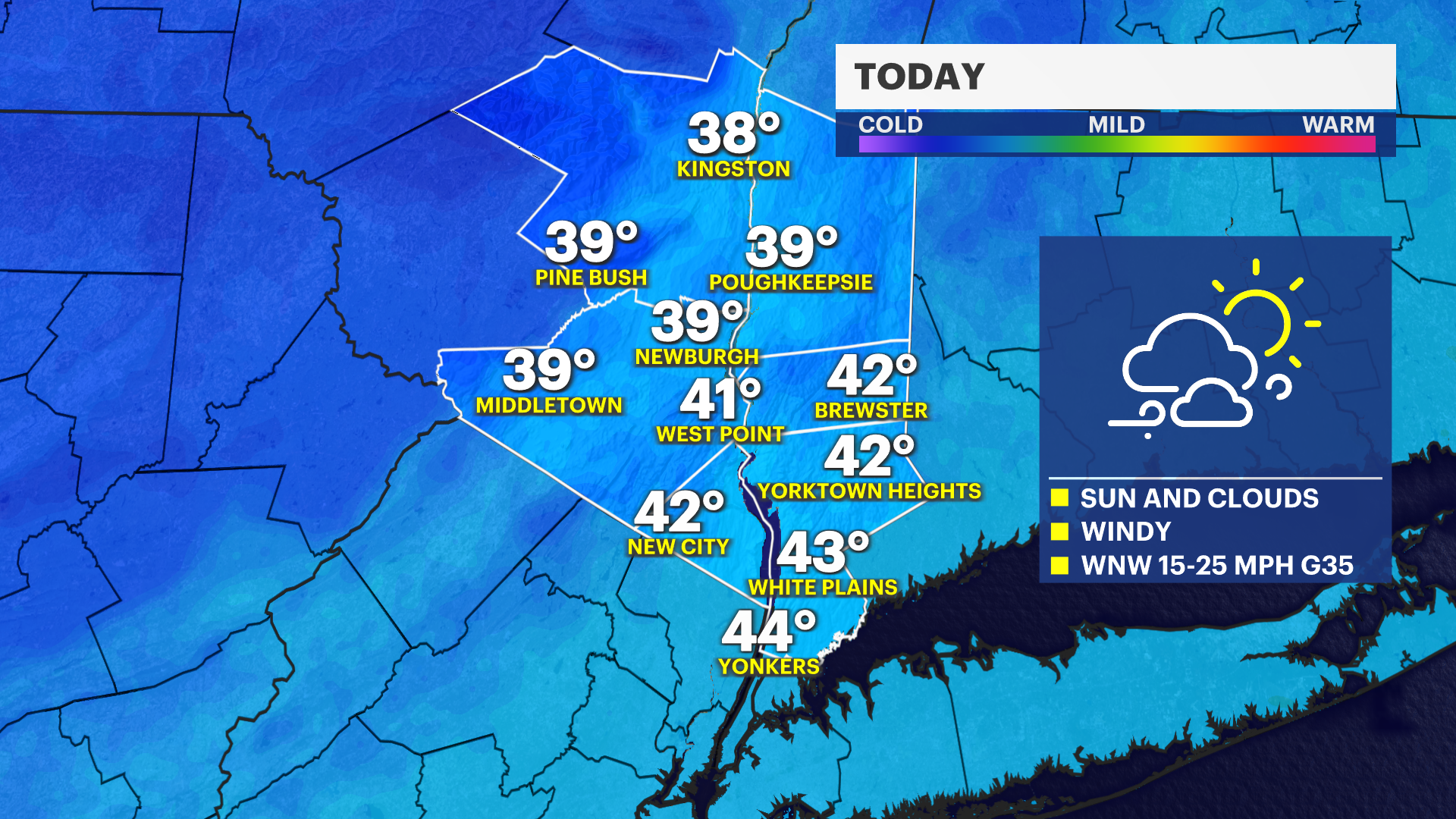 Mild this morning with highs in the mid 40s early this afternoon, then windy with gusts up to 30 mph and cold this evening.