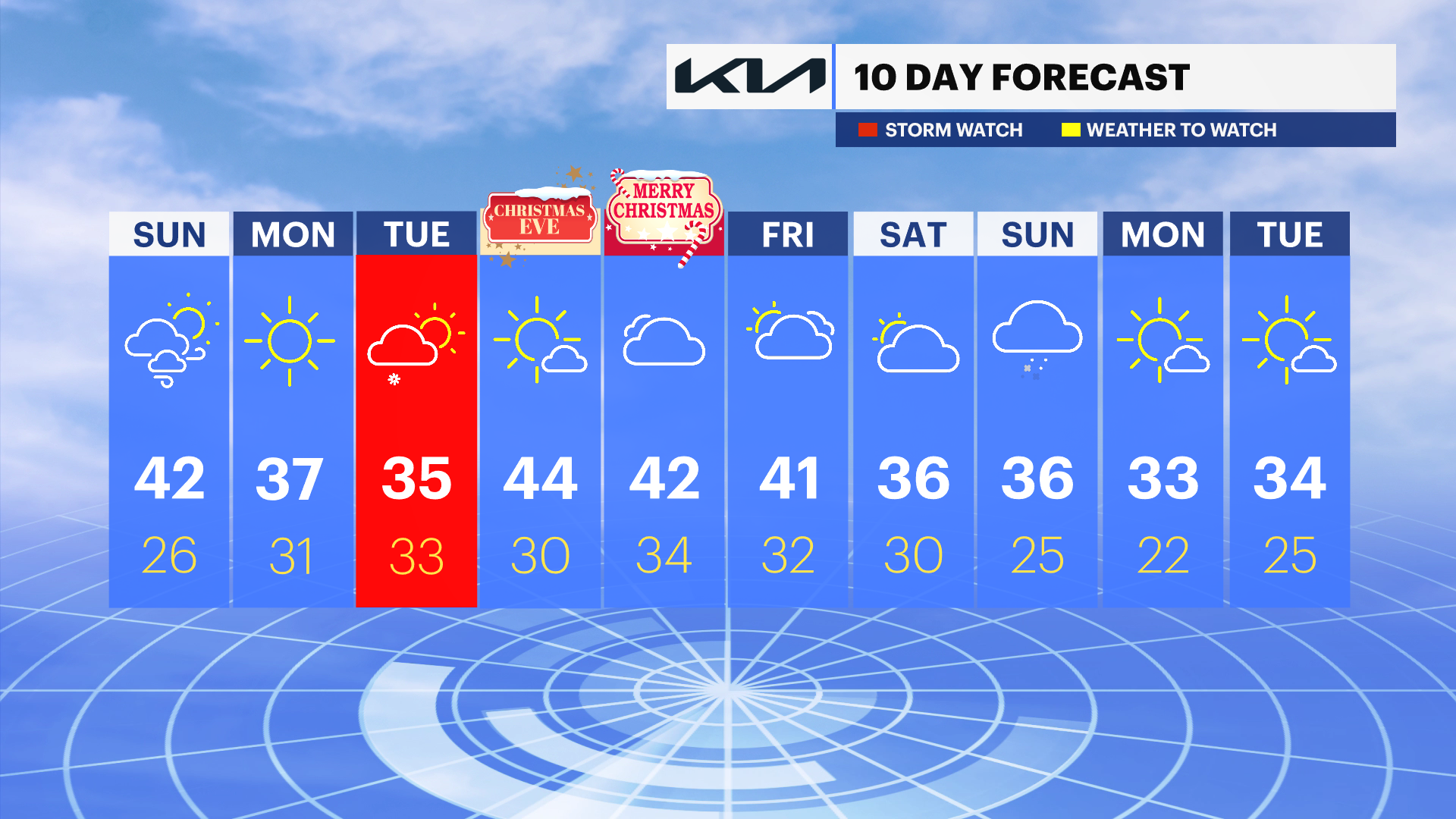 It's a mild start to the day today, but a cold front will move through mid-afternoon and drop temperatures this evening. It's a cold and dry Monday. Keep an eye on Tuesday, rain and snow showers are expected and cloud slow travelers down. Wednesday looks bright and mild for Christmas Eve plans. Christmas Day will be cloudy with a stray rain shower, but temperatures will remain above freezing, so slippery conditions are not expected at any point at the end of this week.