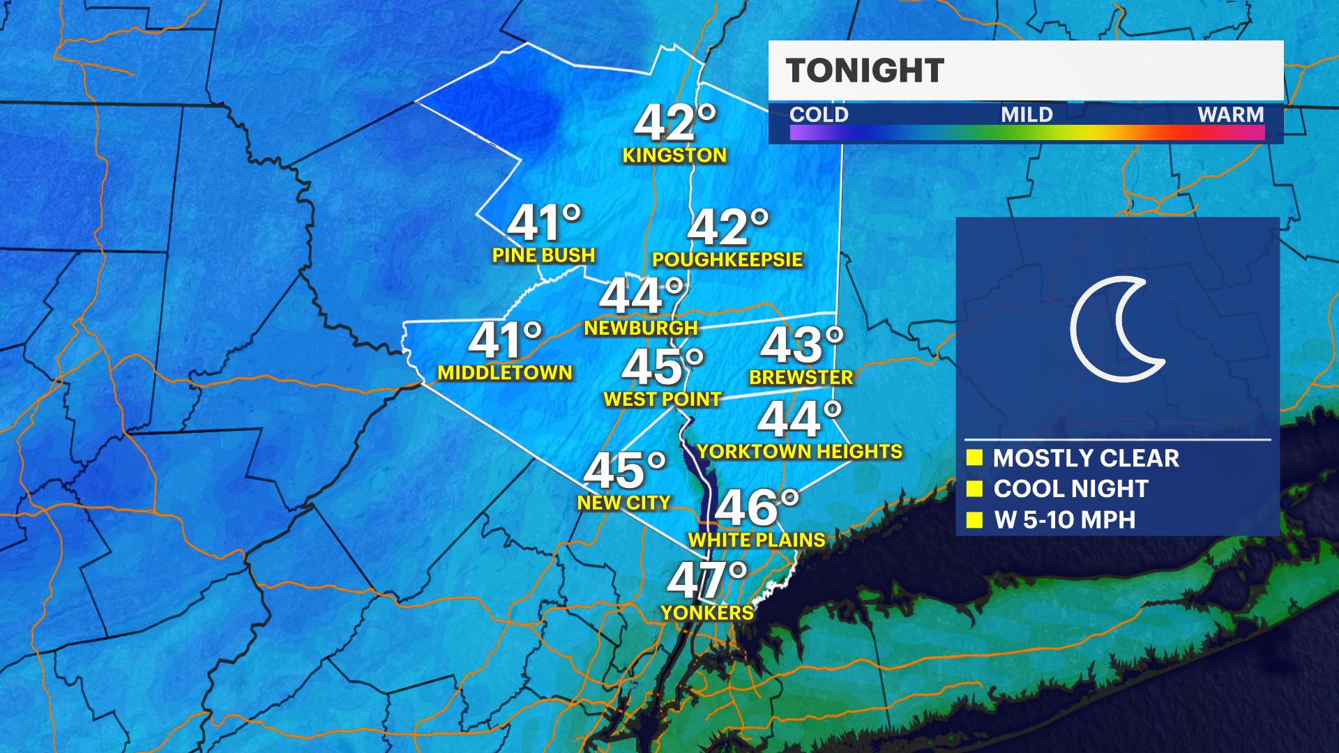 Monday Night: Mostly clear and cooler with lows in the mid-40s.