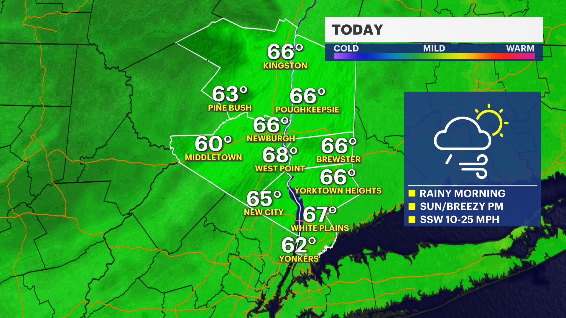 Morning showers move out by midday with cooler, breezy weather this afternoon. Sunshine and mild temps return Tuesday.