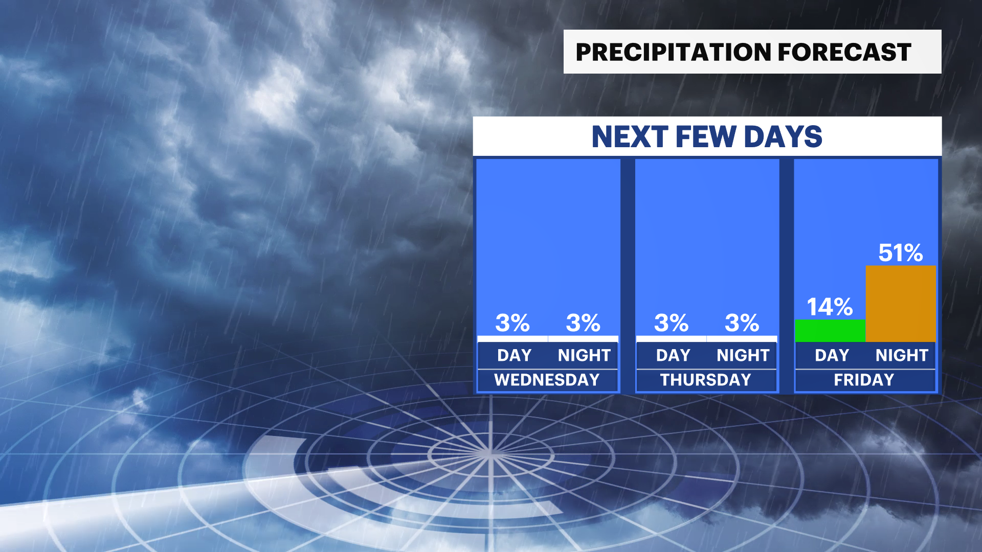 FRIDAY: Cloudy with rain moving late in the second half of the day. Highs: low 50s. Lows: upper 30s to low 40s.