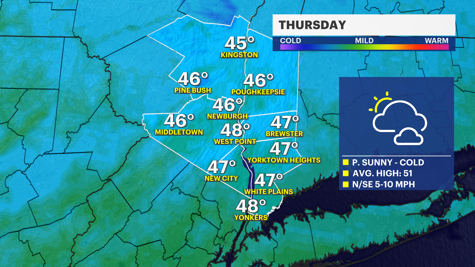 THURSDAY: Mostly sunny to mostly cloudy. Highs: mid to upper 40s. Lows: mid 30s.