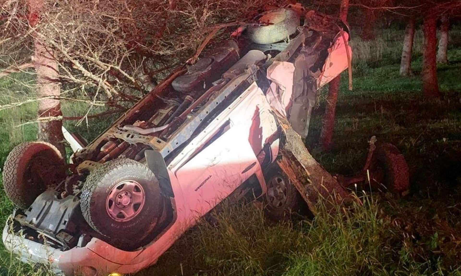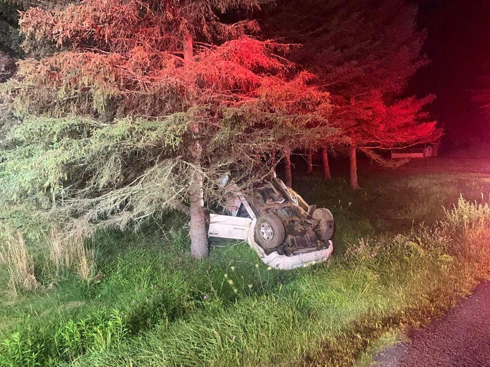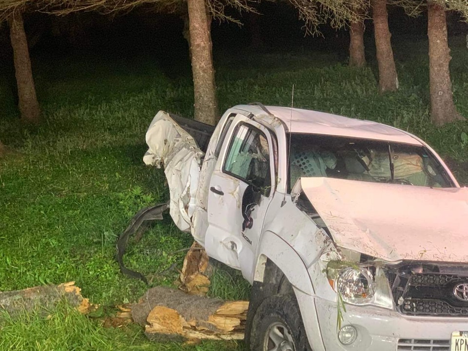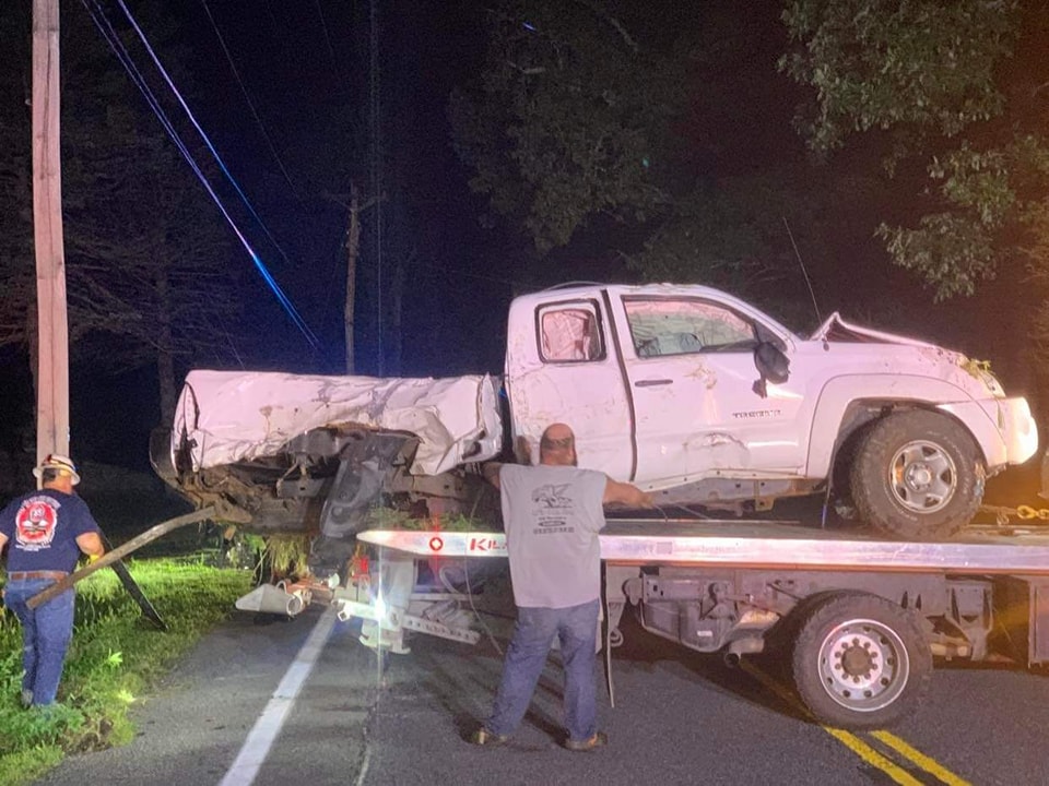 The truck left the road, hit a utility pole and then a tree, officials say.