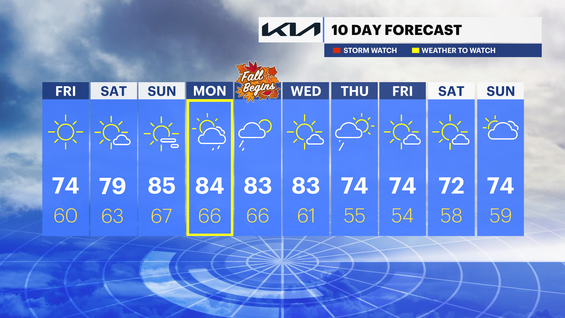 Monday: Clouds move in, rain possible late. Highs near 84, lows near 66.