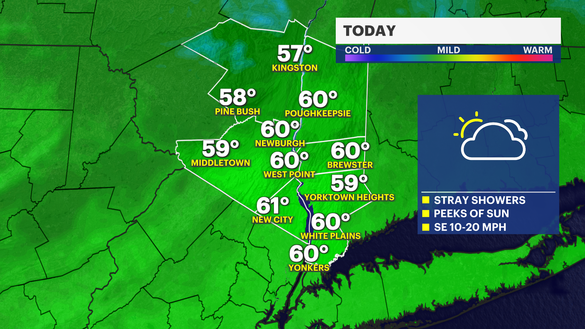Grab the umbrella today. Stray showers are expected to pass through today, mainly after noon time. It's a mild Sunday, just a few degrees lower than Saturday, which reached 64F at White Plains. Showers will be spotty this afternoon through the overnight hours. Monday morning will be foggy with showers until around noon, then the sunshine will return. Temperatures will be in the 50s early Monday, but drop off quickly around 2-4 p.m. when the cold front passes.