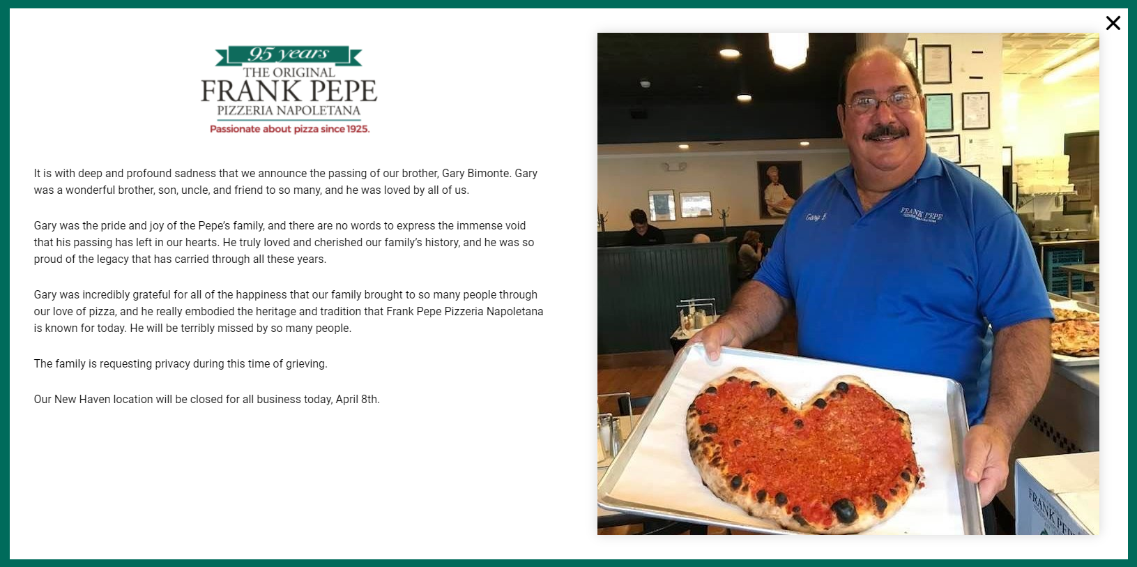 The New Haven pizza chain posted to Twitter, "The New Haven location will be closed for all business today, April 8th, as we mourn the passing of our brother and friend, Gary Bimonte."