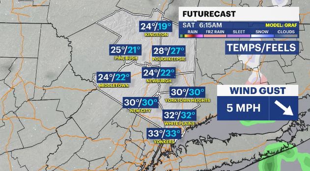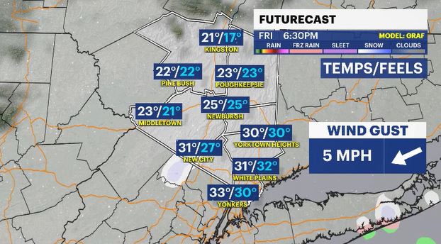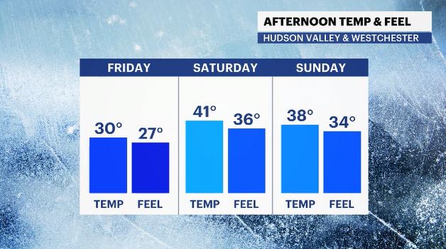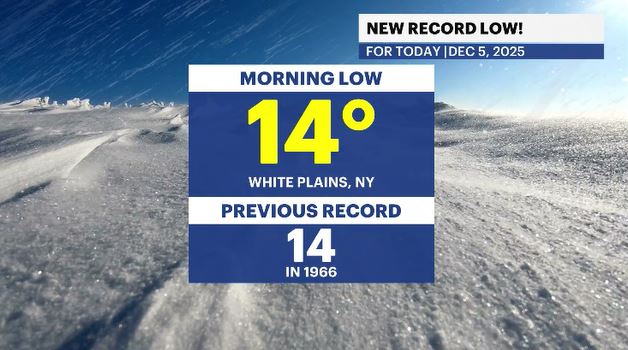 Temperatures this morning tied the record low for White Plains of 14 degrees (set in 1966). Factor in a light breeze though, and the temps will feel into the single digits. Temperatures will try to warm up later today but will struggle to do so. Across the region, high temperatures are forecast to get into upper-20s to low-30s.
