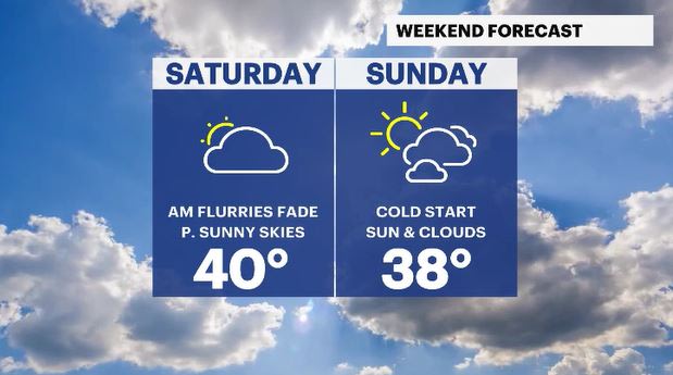 SATURDAY: Mostly cloudy with any flurries fading early on to a mix of sun and clouds. Highs: upper-30s to low-40s. Lows: mid-20s.