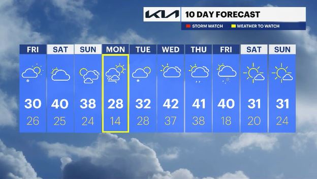 SUNDAY: Mix of sun and clouds. Highs: upper-30s. Lows: mid-20s.