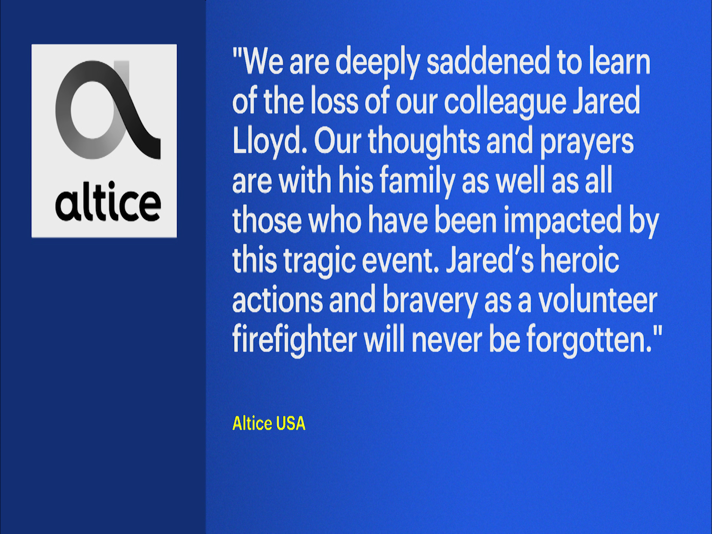 Altice released a statement saying, "We are deeply saddened to learn of the loss of our colleague Jared Lloyd. Our thoughts and prayers are with his family as well as all those who have been impacted by this tragic event. Jared’s heroic actions and bravery as a volunteer firefighter will never be forgotten."