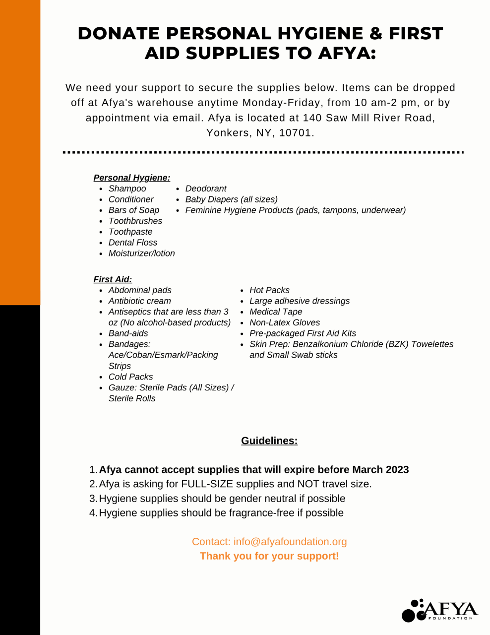 donate supplies to the Afya Foundation. Items can be dropped off anytime