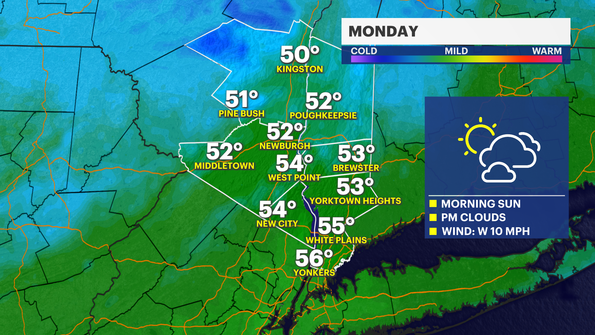 A breezy rain shower is expected Monday evening in the lower Hudson Valley and in the upper Hudson Valley a few snowflakes could mix in; however, no accumulation is expected. Temperatures will quickly drop into the 30s Monday night.