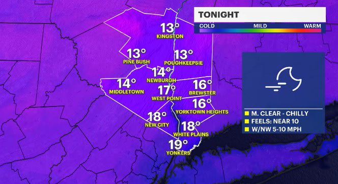 TONIGHT: Mostly clear & still rather chilly. Temps could feel near 10 degrees or colder overnight. Lows: low 10s to low 20s.