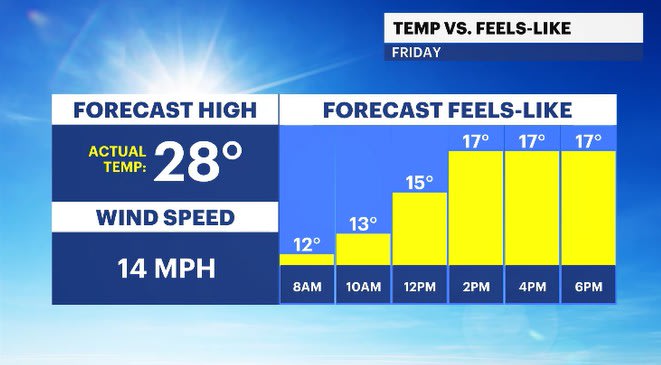Temps will trend below average through the day and will feel even colder when breezy winds are factored in.