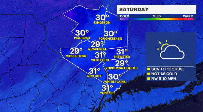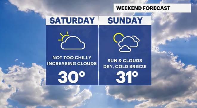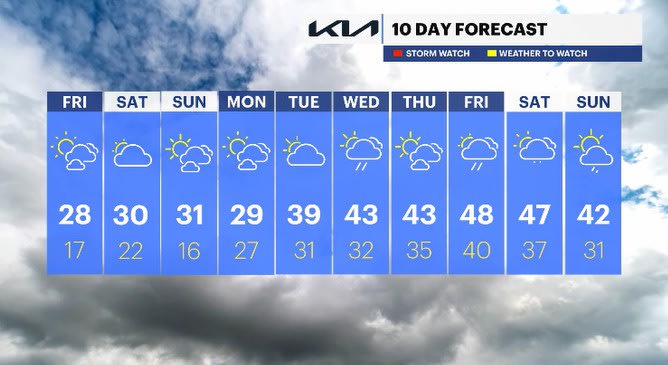 SATURDAY: Mostly cloudy. Highs: upper 20s to low 30s. Lows: upper 10s to low 20s.