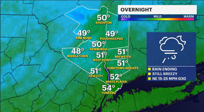 OVERNIGHT: The rain will be ending overnight, but it will still be breezy and very cool. Lows in the low 50s.