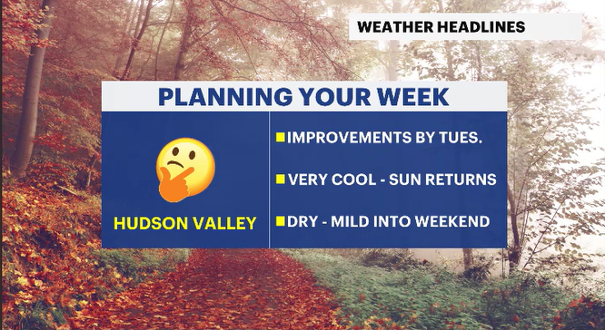 TUESDAY: A cloudy start with rain showers or sprinkles expected to end by morning. The rest of the day will be dry, with winds tapering off and skies slowly clearing. Highs near 60 degrees. Lows in the low 50s.