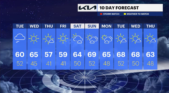 WEDNESDAY: Sunny, near-seasonal temperatures, less wind, and cool. Highs in the mid-60s. Lows in the mid-40s.
