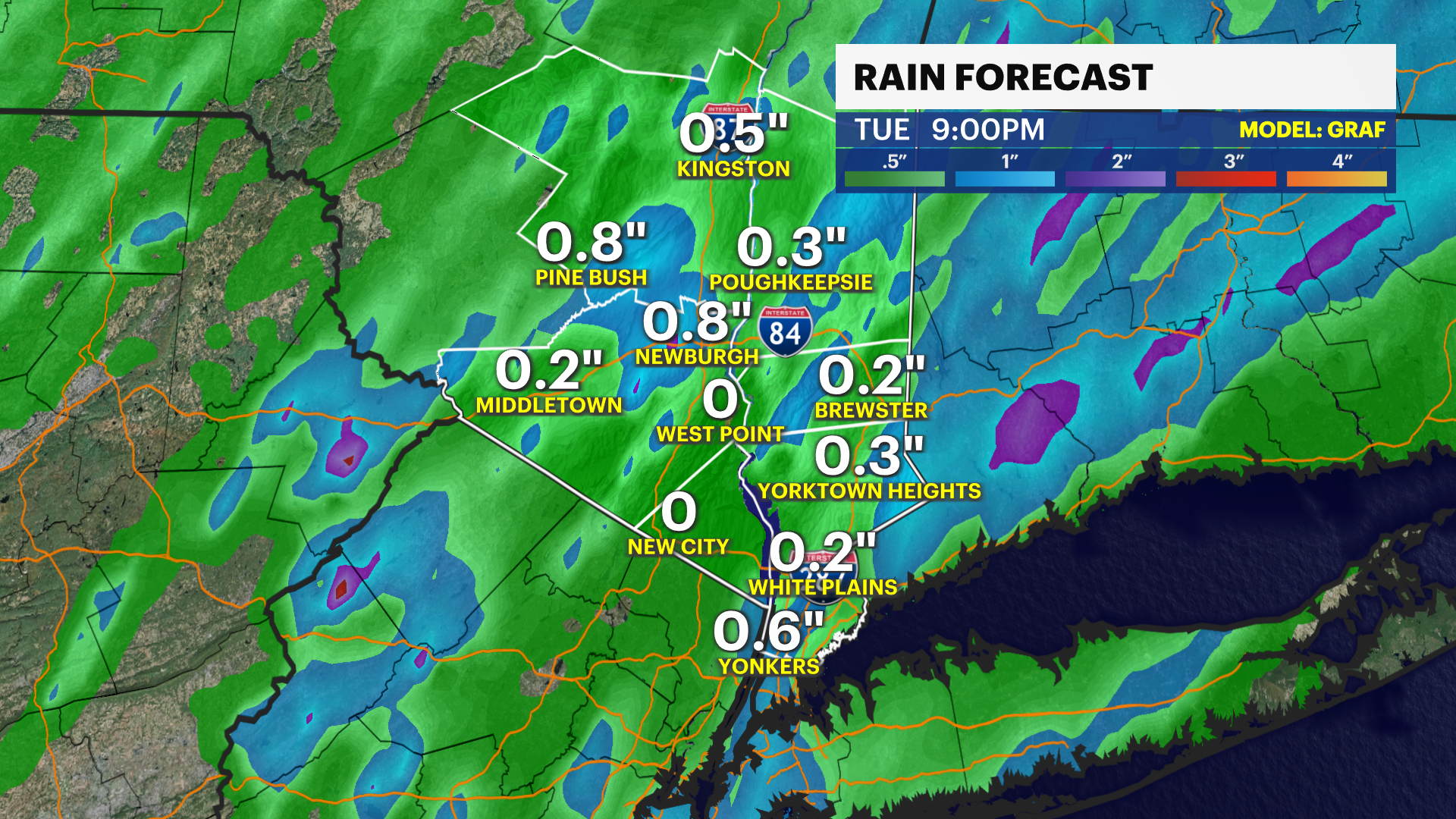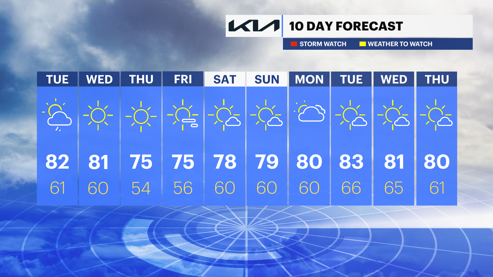 TUESDAY: Early low clouds and spotty showers. Breaks of sun into the afternoon with a couple of pop-up showers around midday. Clearing in the evening. Highs around 82. Lows near 61.