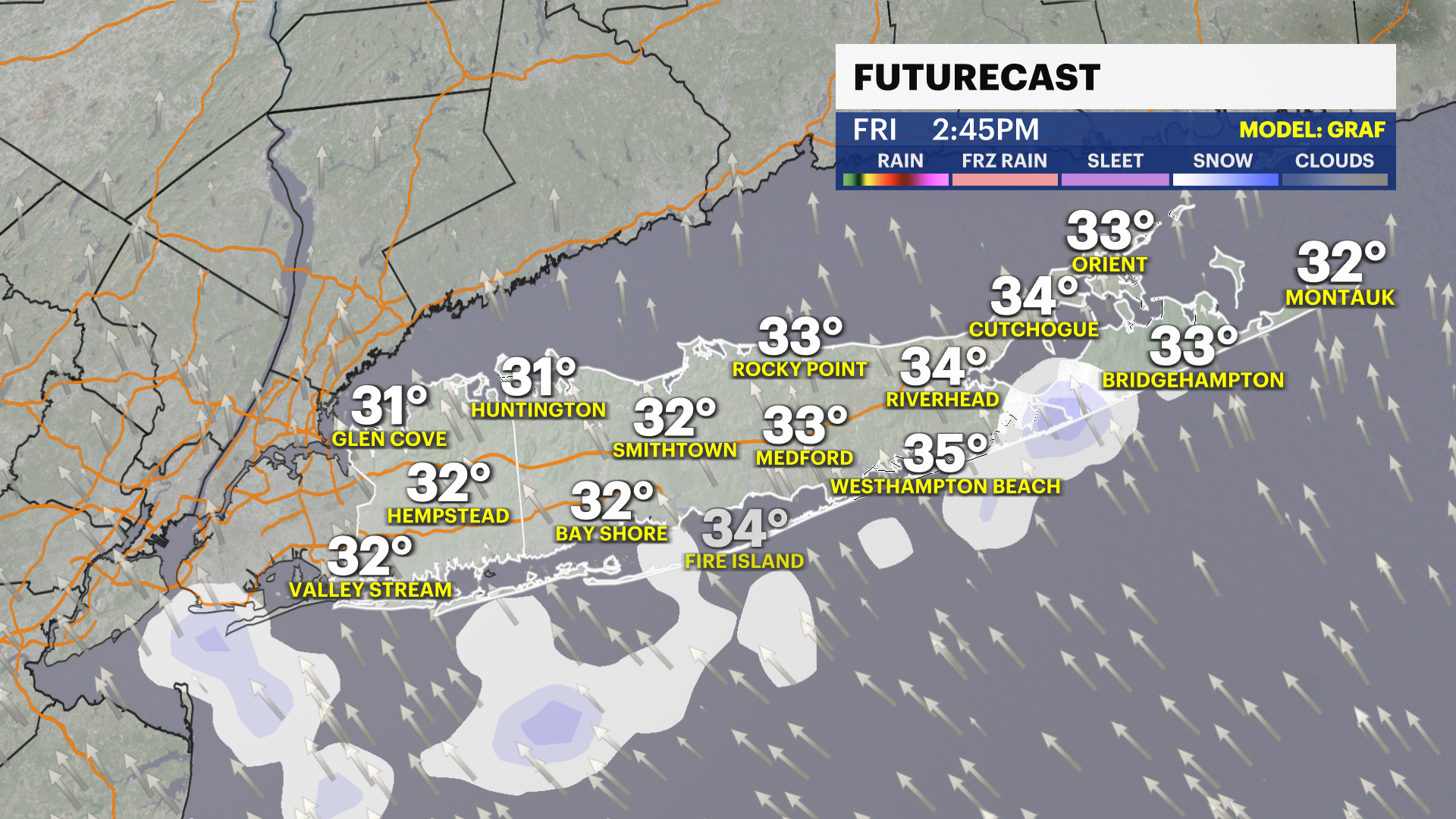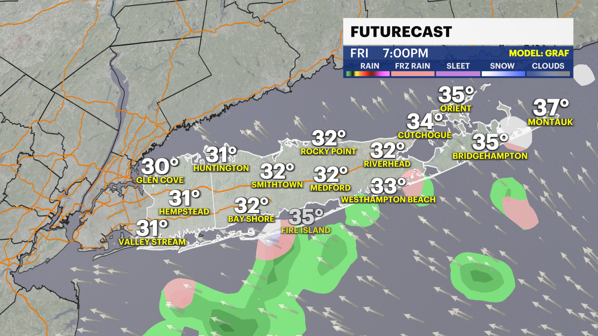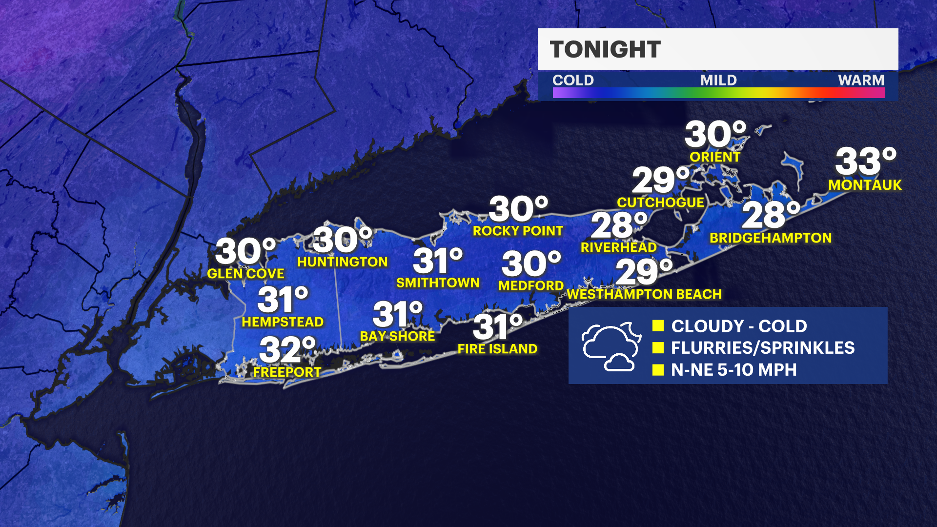 FRIDAY: Cold, clouds and sun. Highs in the low 30s, lows in the high 20s. Low chances of flurries and raindrops overnight.