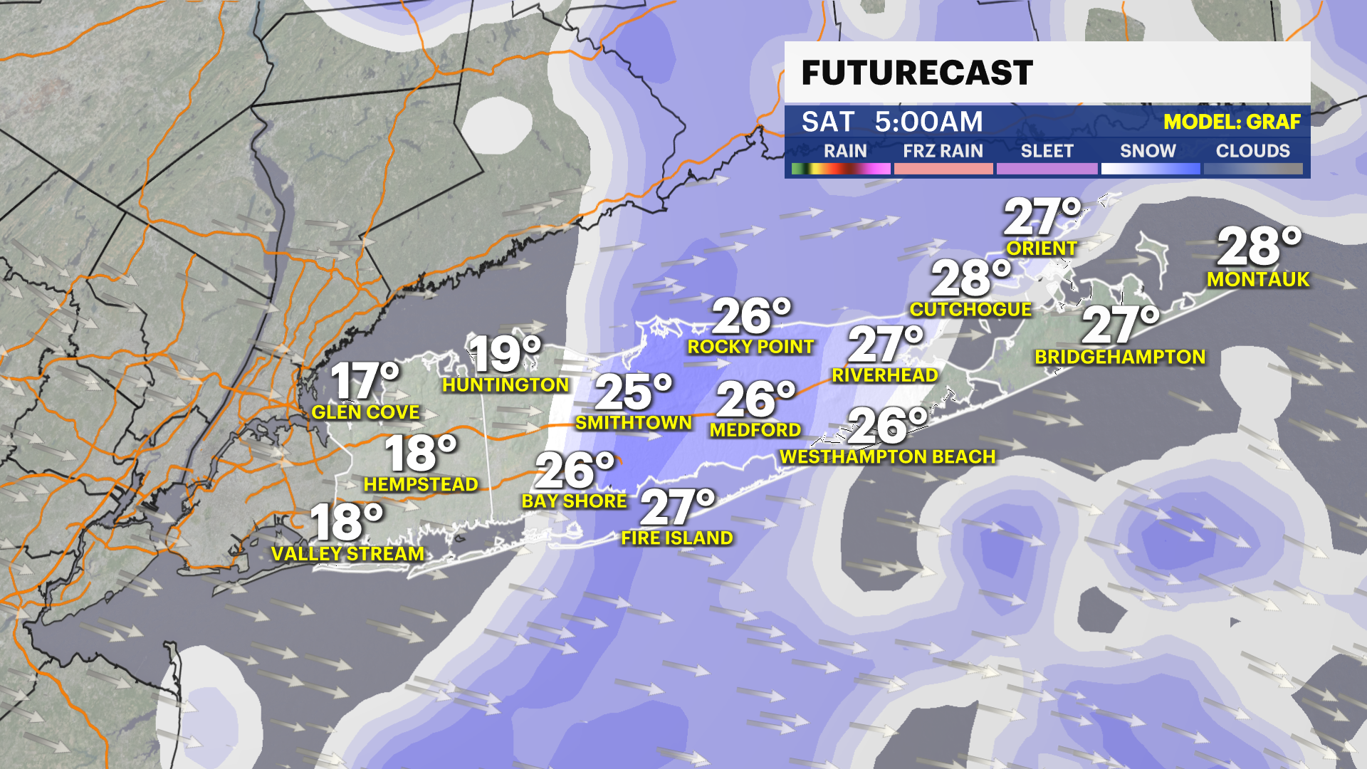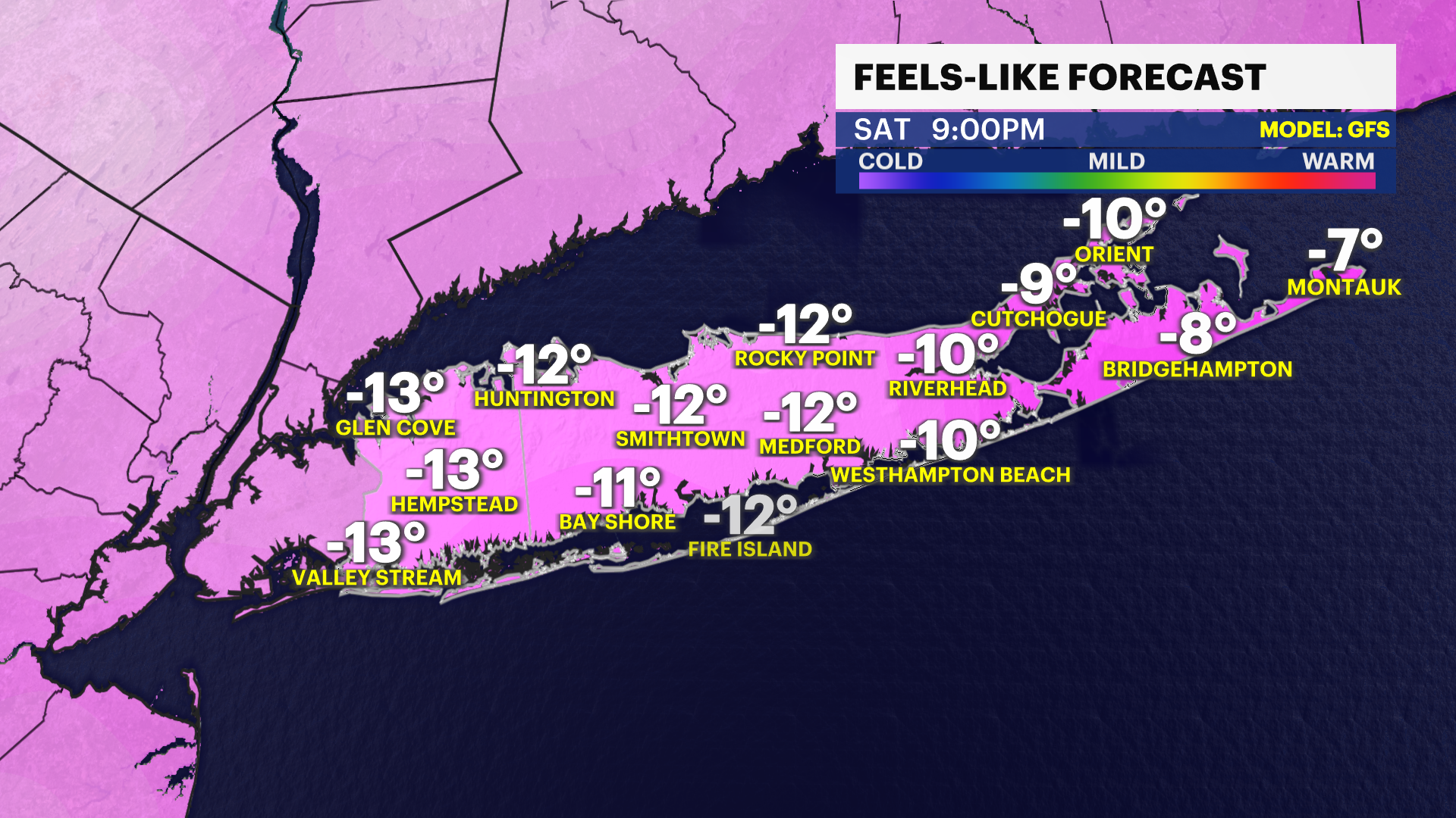 ALERTS: Extreme cold warning for Nassau and Suffolk counties will be in effect from Saturday 1 p.m. through Sunday 1 p.m. Wind advisory for Nassau and Suffolk counties will be in effect from Saturday 9 a.m. to Sunday 12 a.m.