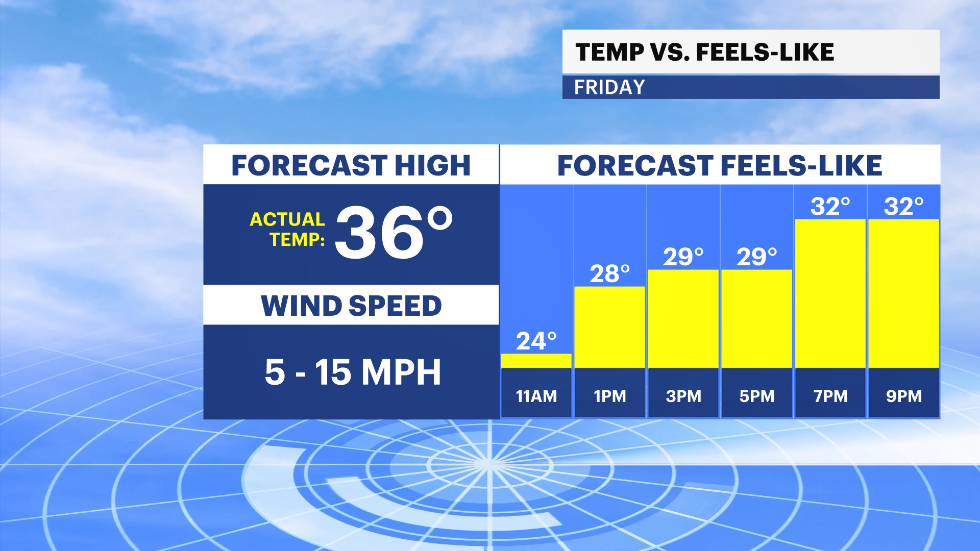Clouds will mix in through the day. Thursday night into Friday, lows drop into the teens, and with breezy conditions lingering, it could feel closer to single digits to start Friday morning.