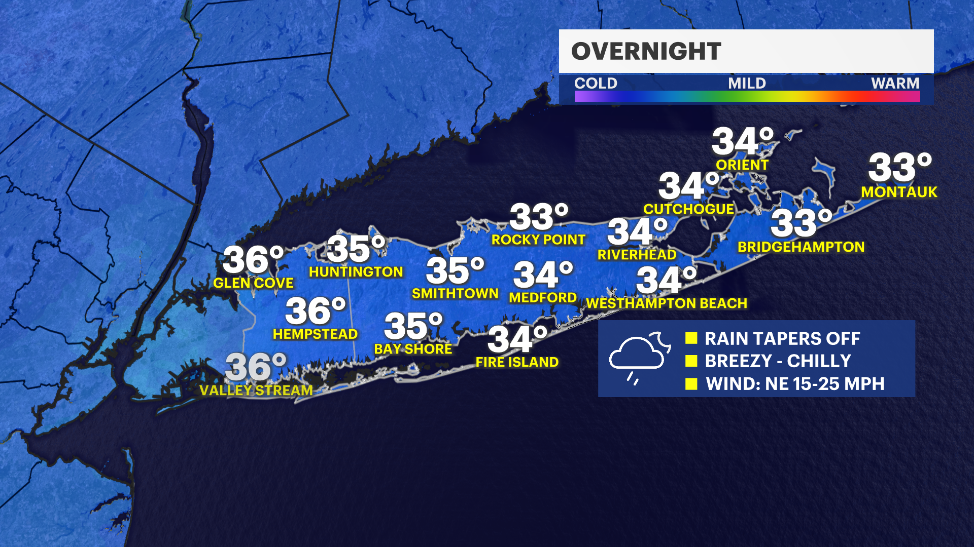 Sunday: Cloudy with showers in the morning. Areas of drizzle and fog. Sun and clouds for the afternoon. We could see a wide range of temperatures. Nassau county can be in the 60s, Western Suffolk 55 to 60 for highs and then the East End 47 to 53. Water temperatures are in the 30s and that plays a huge role in cooling down the East End and south shore.