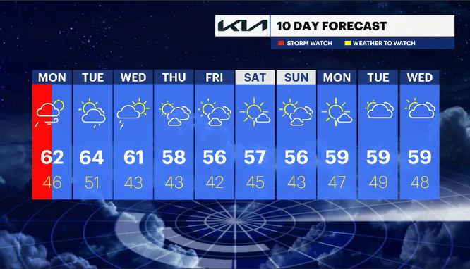 MONDAY: Expecting a slippery and windy morning commute. The storms will end quickly in the morning, leading to a cloudy, drier, and breezier day that is also much cooler. Highs in the low 60s.