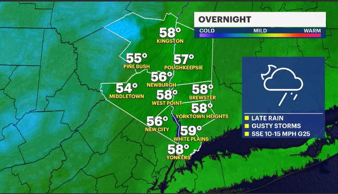 OVERNIGHT: Rain will arrive along with strong winds gusting between 30-40 MPH and could reach around 50 mph. Heavy rain at times into the morning commute. Lows in the upper 50s.