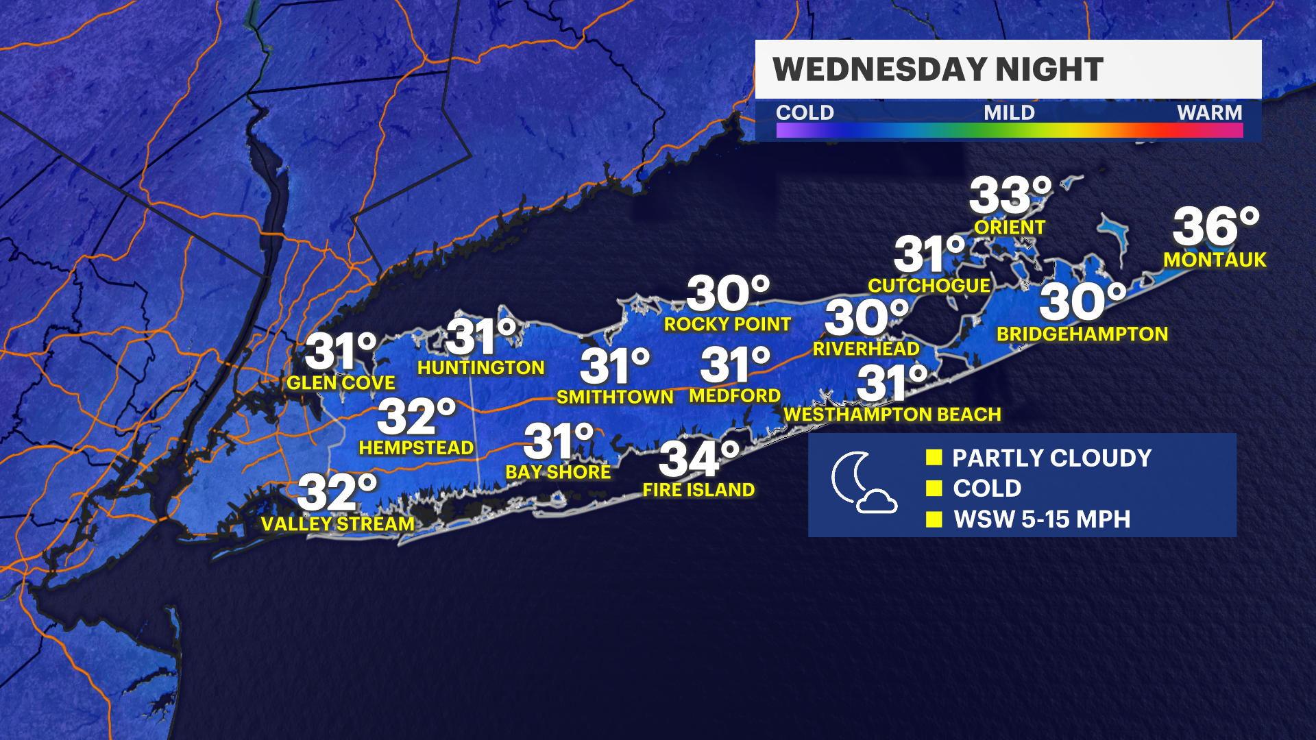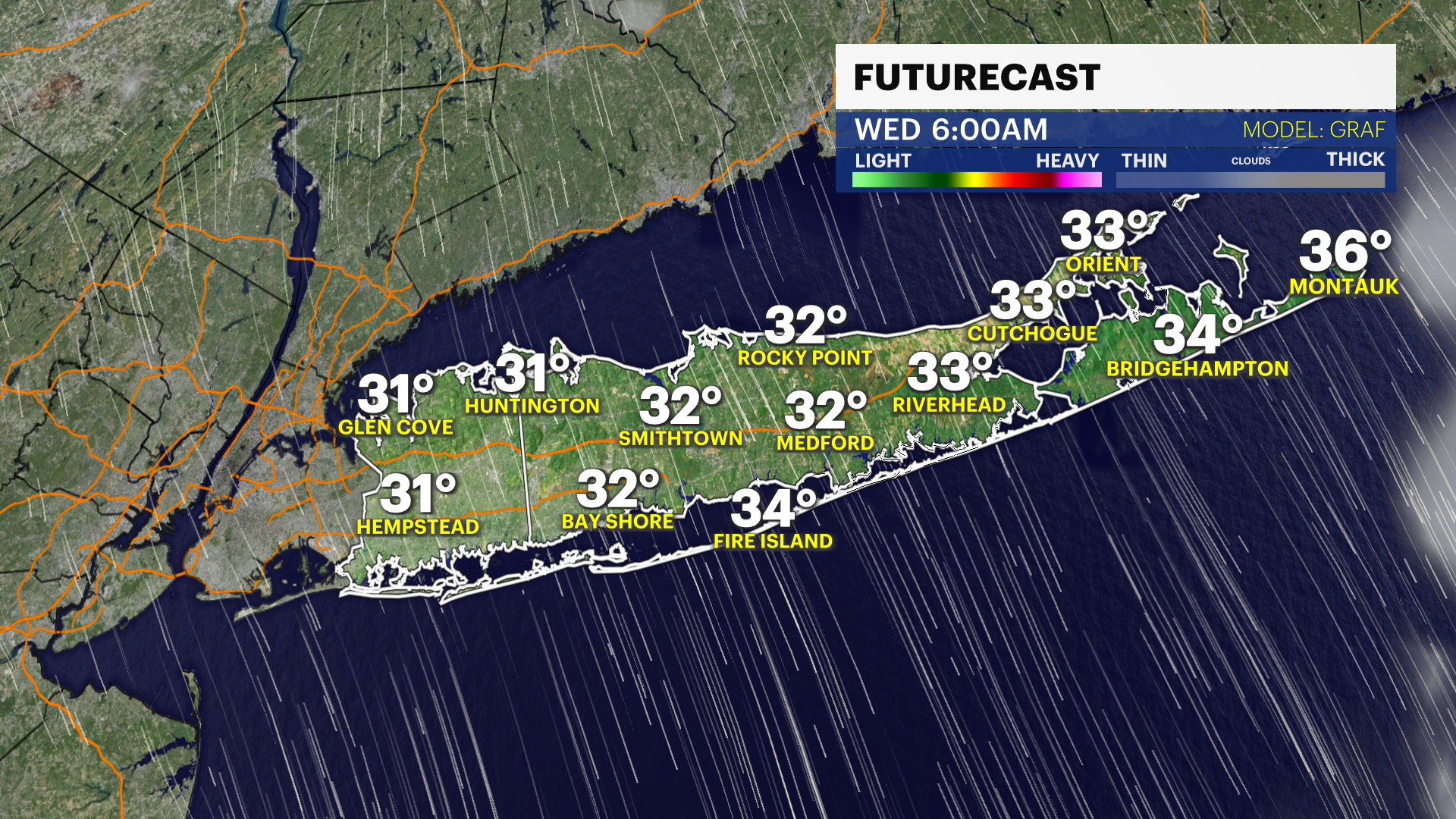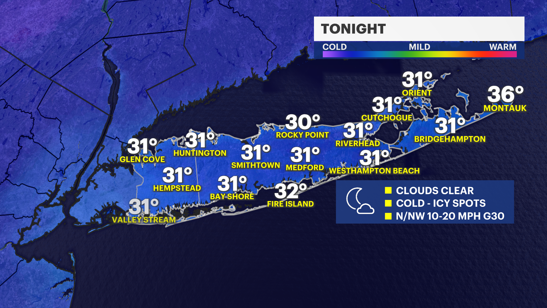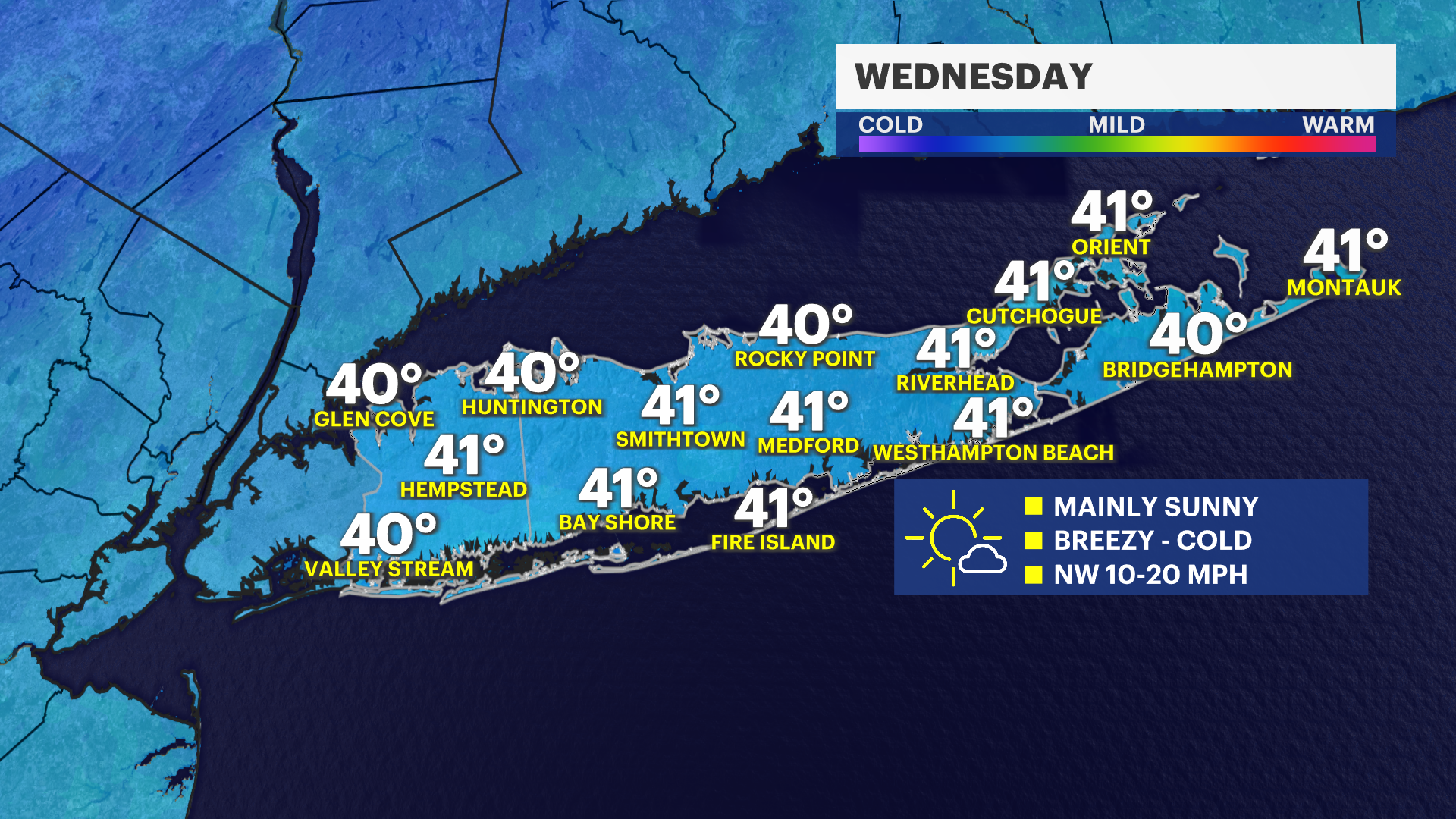 THURSDAY: Partly sunny and breezy. Highs around 42 degrees. Much colder at night with lows near 18 degrees.