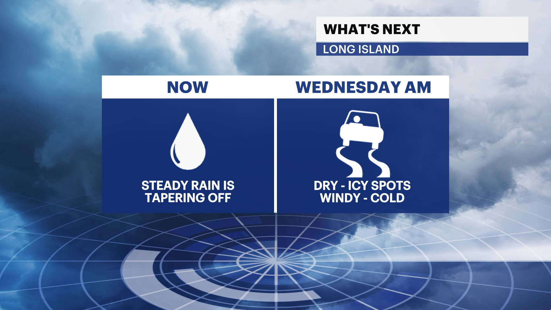 TONIGHT: Lingering showers end. Clouds gradually clear overnight. It will be a bit windy which will help start to dry the ground up. Wind: north-northwest 10 to 20 mph with some gusts near 30 mph. As temperatures fall into the low 30s overnight, patchy areas of black ice can form early Wednesday morning. Please use caution.