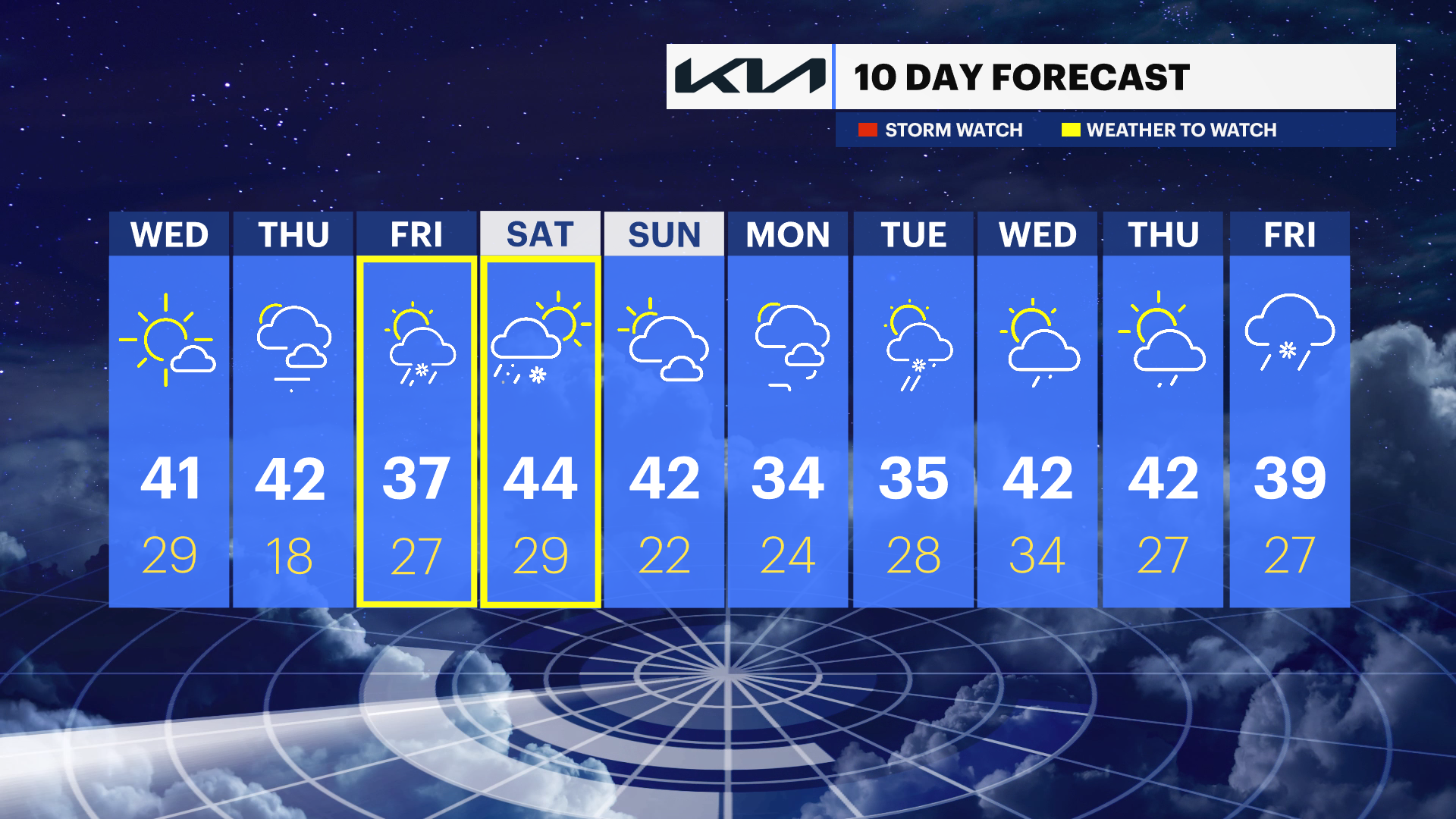 SUNDAY: Partly sunny. Highs around 42 degrees. Lows near 22 degrees.
