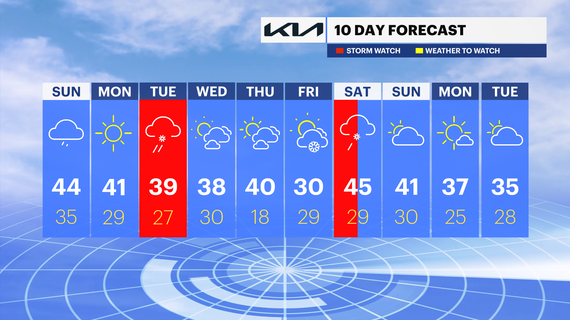 Monday is cold and sunny with highs in the low 40s, feeling like the mid 30s with winds W 15 mph.