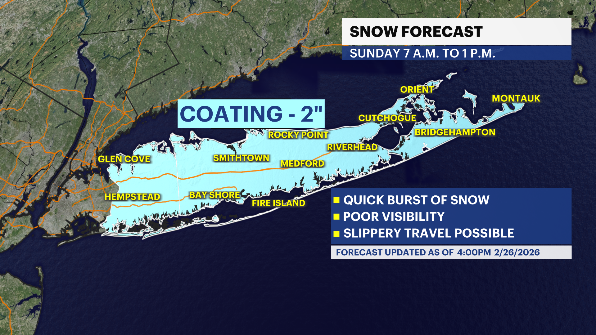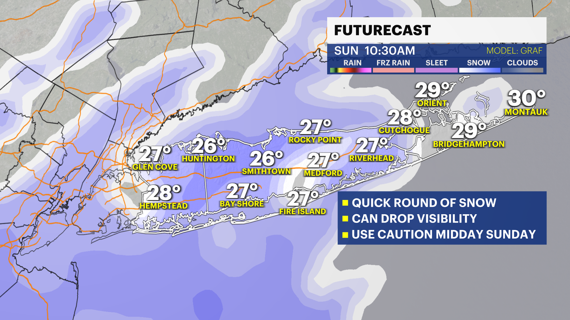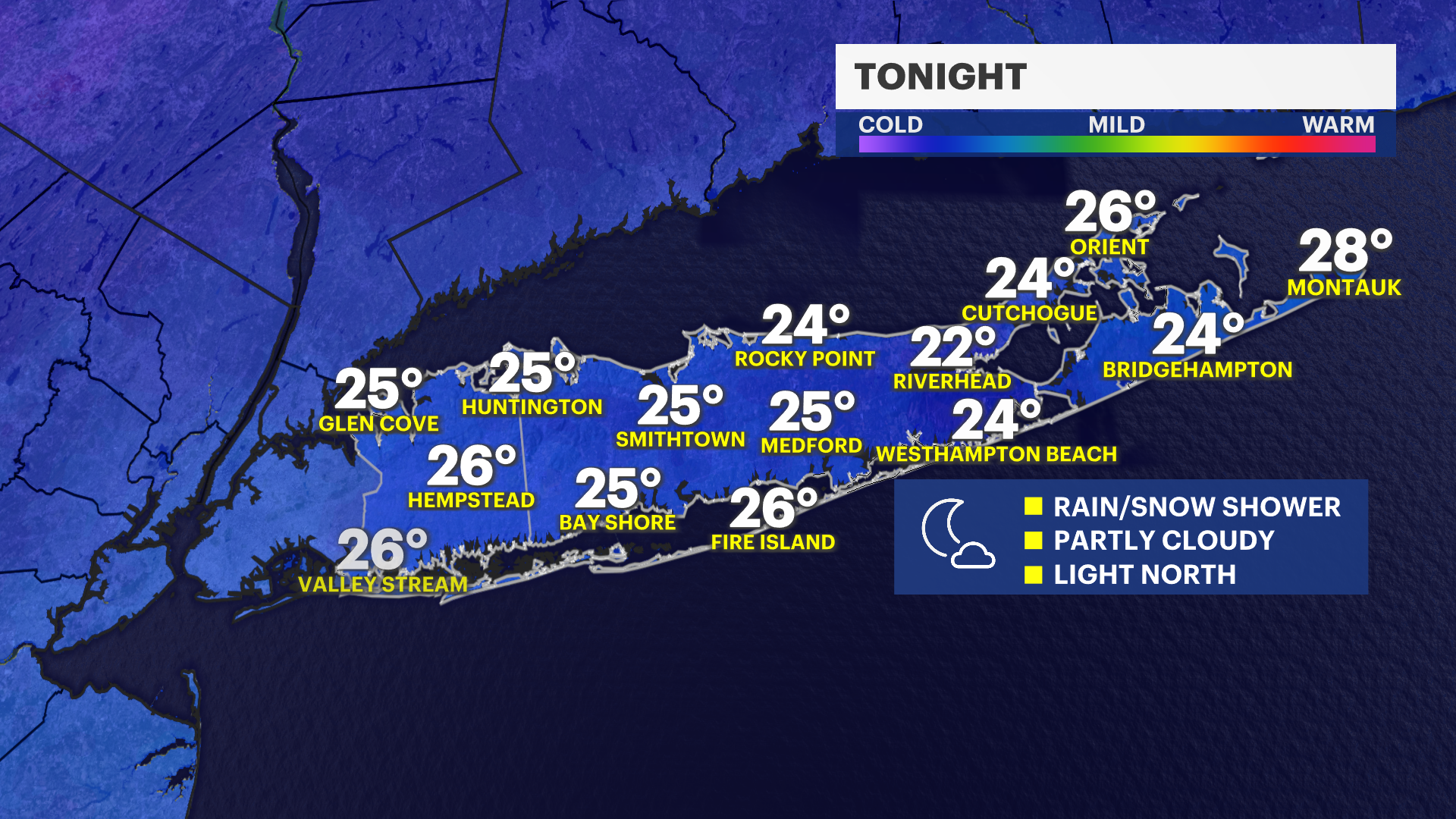 Thursday: While most of Long Island is likely to stay dry, a few spotty snow showers cannot be ruled out in the afternoon and evening. This could cause a spotty coating, but again - most of this snow is likely to remain south of Nassau and Suffolk Counties.