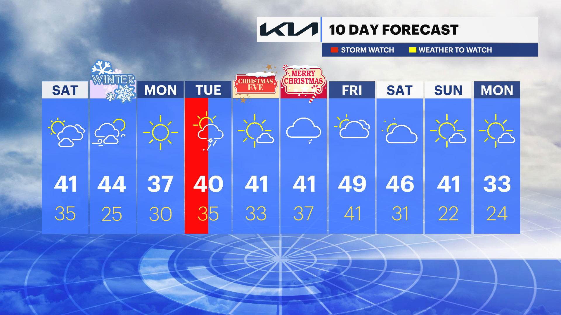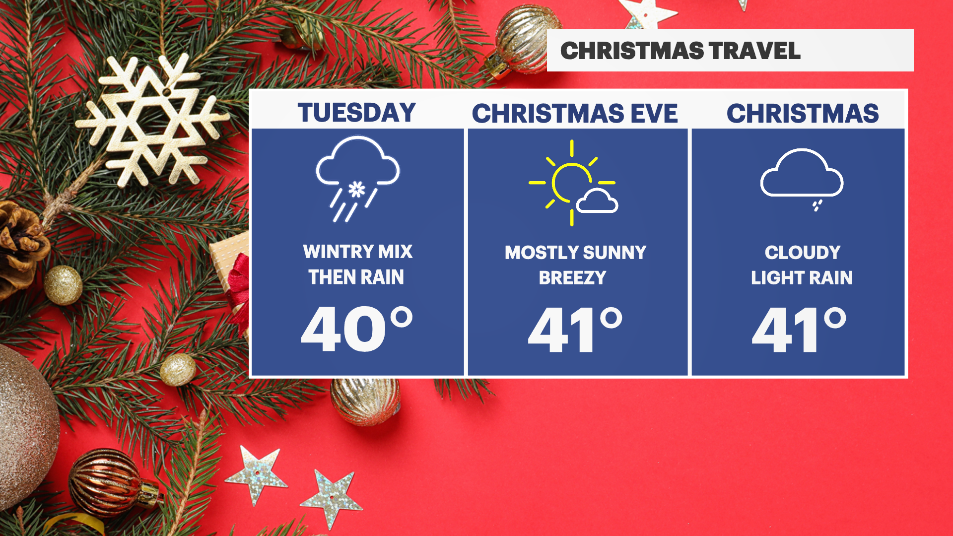 It's a mild start to the day today, but a cold front will move through mid-afternoon and drop temperatures this evening. It's a cold and dry Monday. Keep an eye on Tuesday, rain and snow showers are expected and cloud slow travelers down. Wednesday looks bright and mild for Christmas Eve plans. Christmas Day will be cloudy with a stray rain shower, but temperatures will remain above freezing so slippery conditions are not expected at any point at the end of this week.