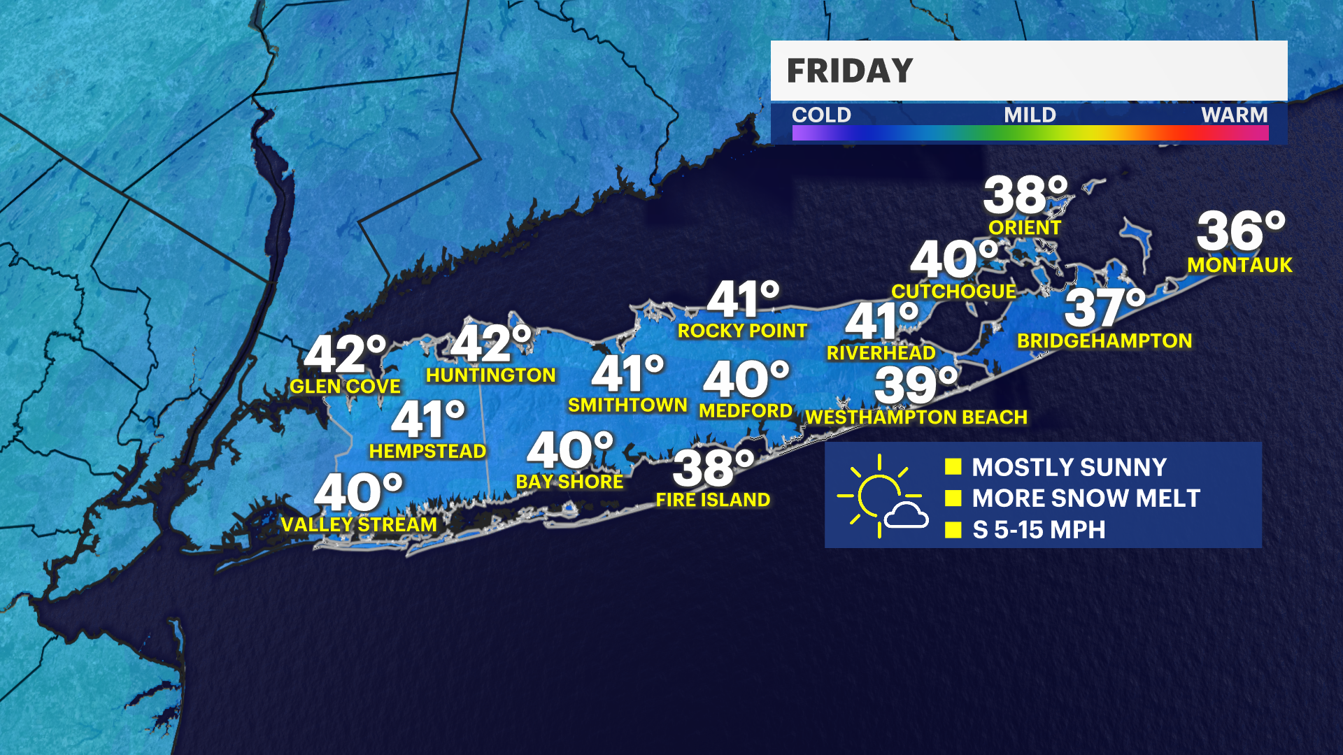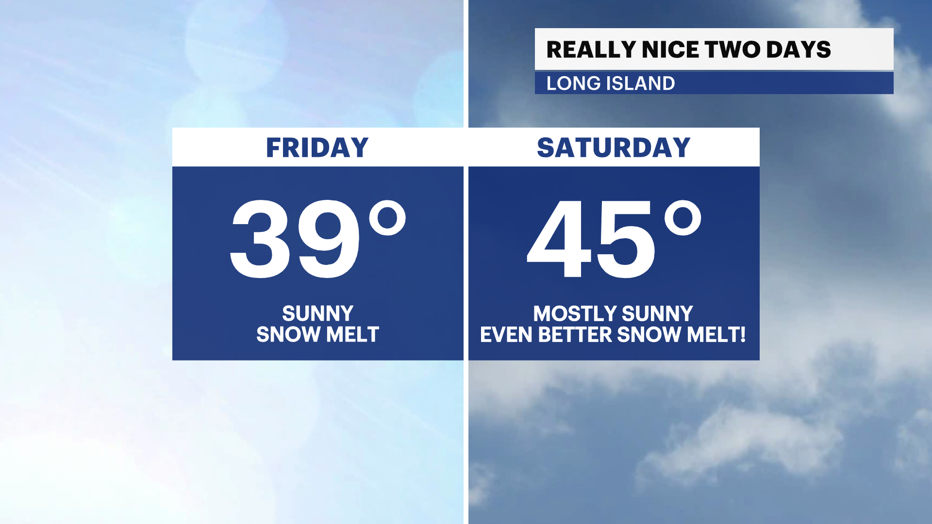 After the 1 to 3 inches of new snow across Long Island on Wednesday morning with dangerous travel, the afternoon shaped up very nicely with sun and high temperatures around 40 degrees. That new snow melted very quickly, along with some of the snow from the blizzard, too!