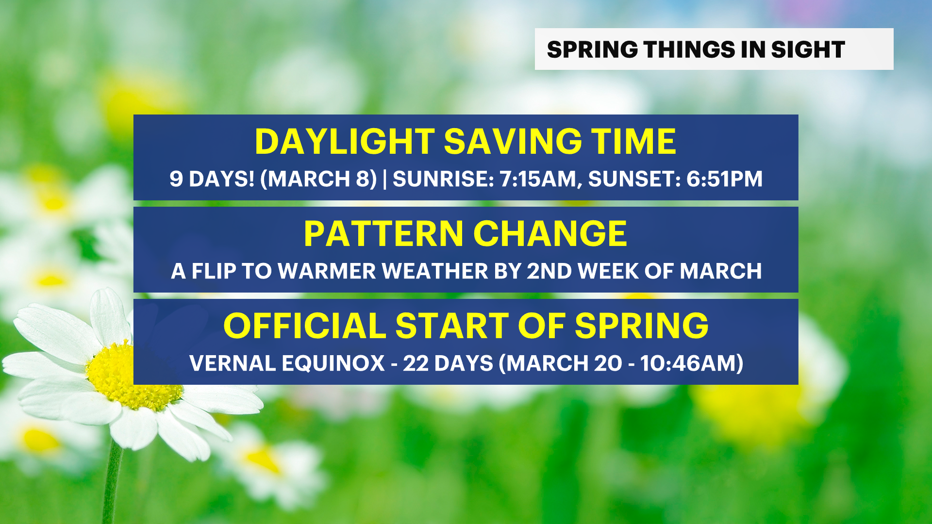 SUNDAY: Morning light snow. Another new coating to one inch of snow cannot be ruled out. Afternoon breaks of sunshine. Highs around 38 degrees. Lows near 18 degrees.