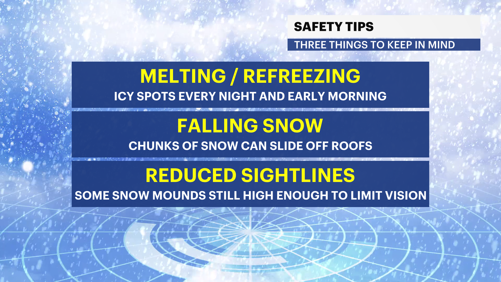 Please continue to be careful with areas of snow and ice on the ground. Each day going forward, there will be warm enough daytime temperatures to allow for snow melt and cold enough overnight temperatures to cause refreezing and black ice. This pattern will continue for quite some time. Below you will find a few additional things to watch out for following such a big storm.